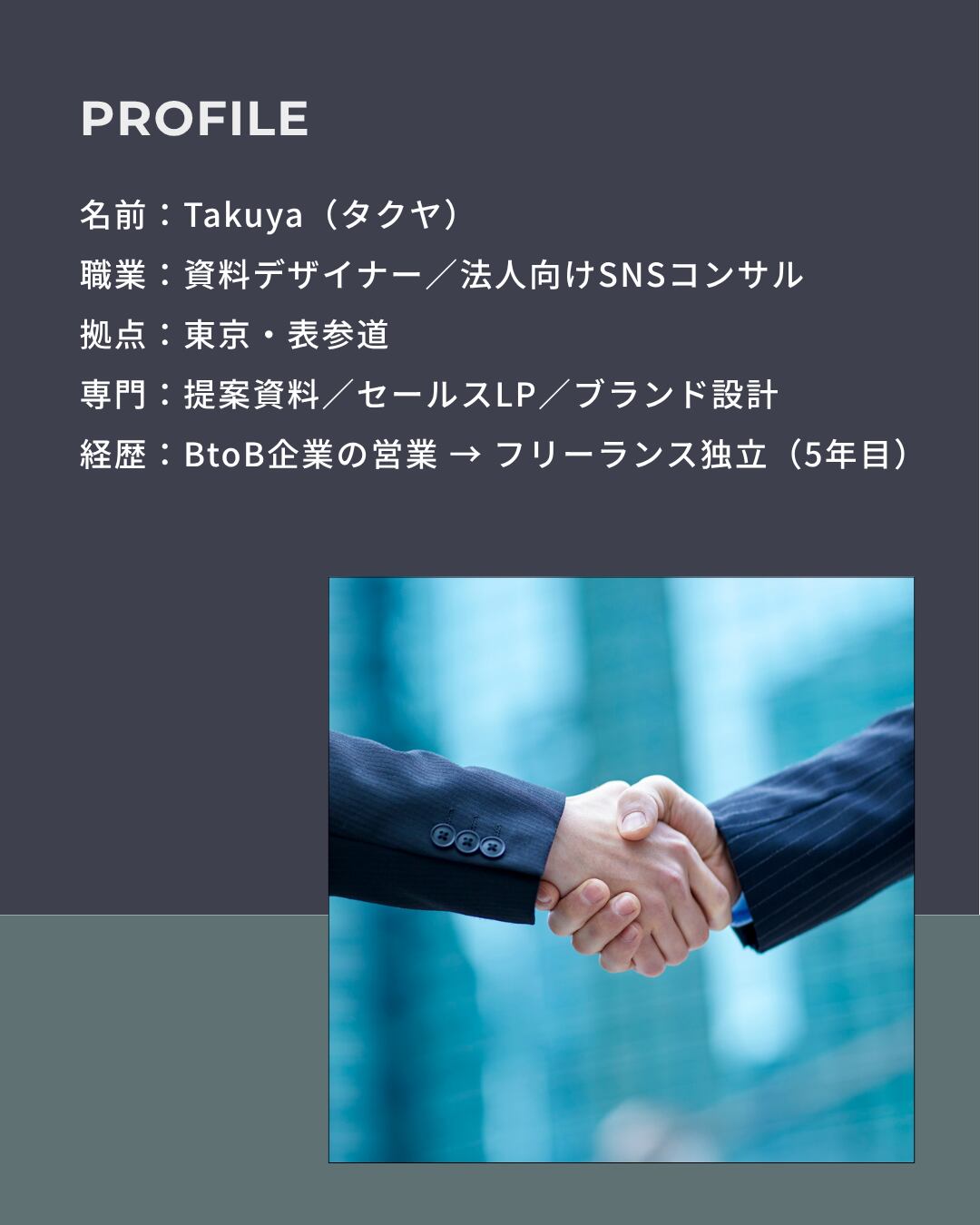 ・表紙タイトル(例:「はじめまして!ビジネスデザインパートナーのTakuyaです」)