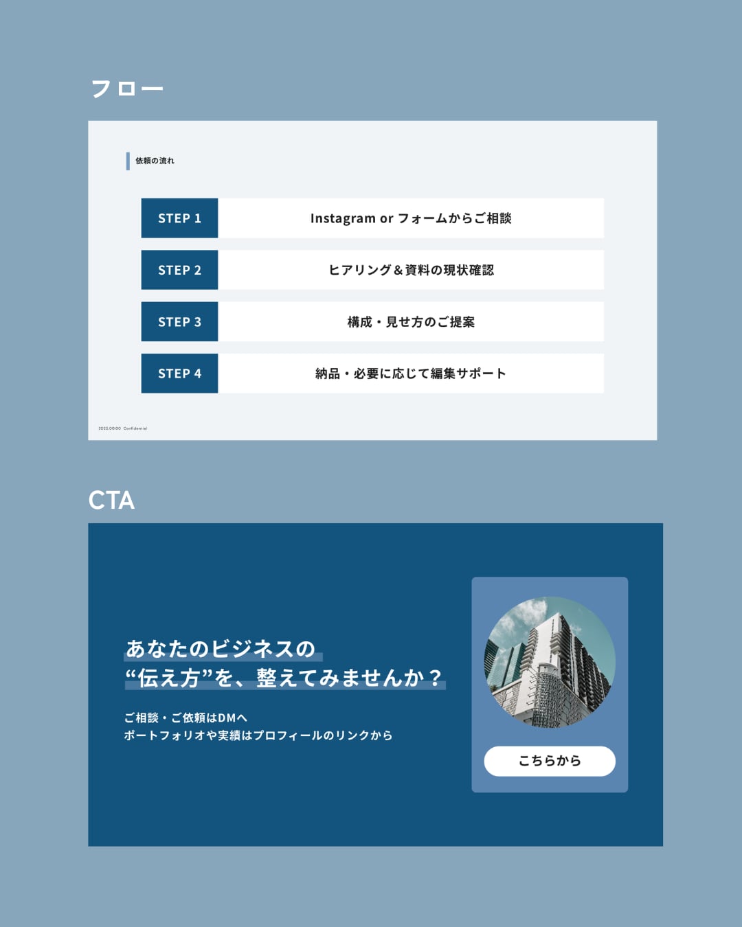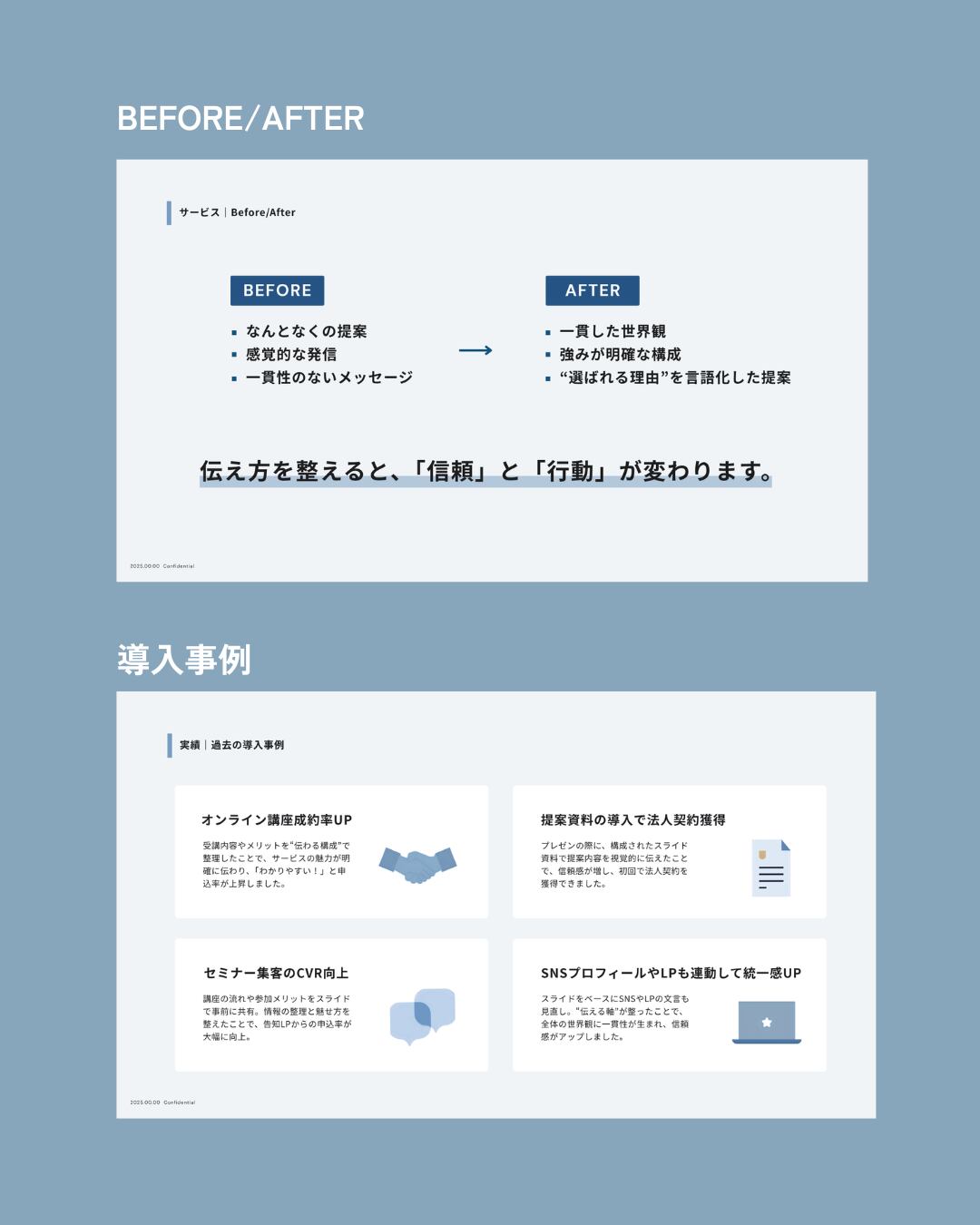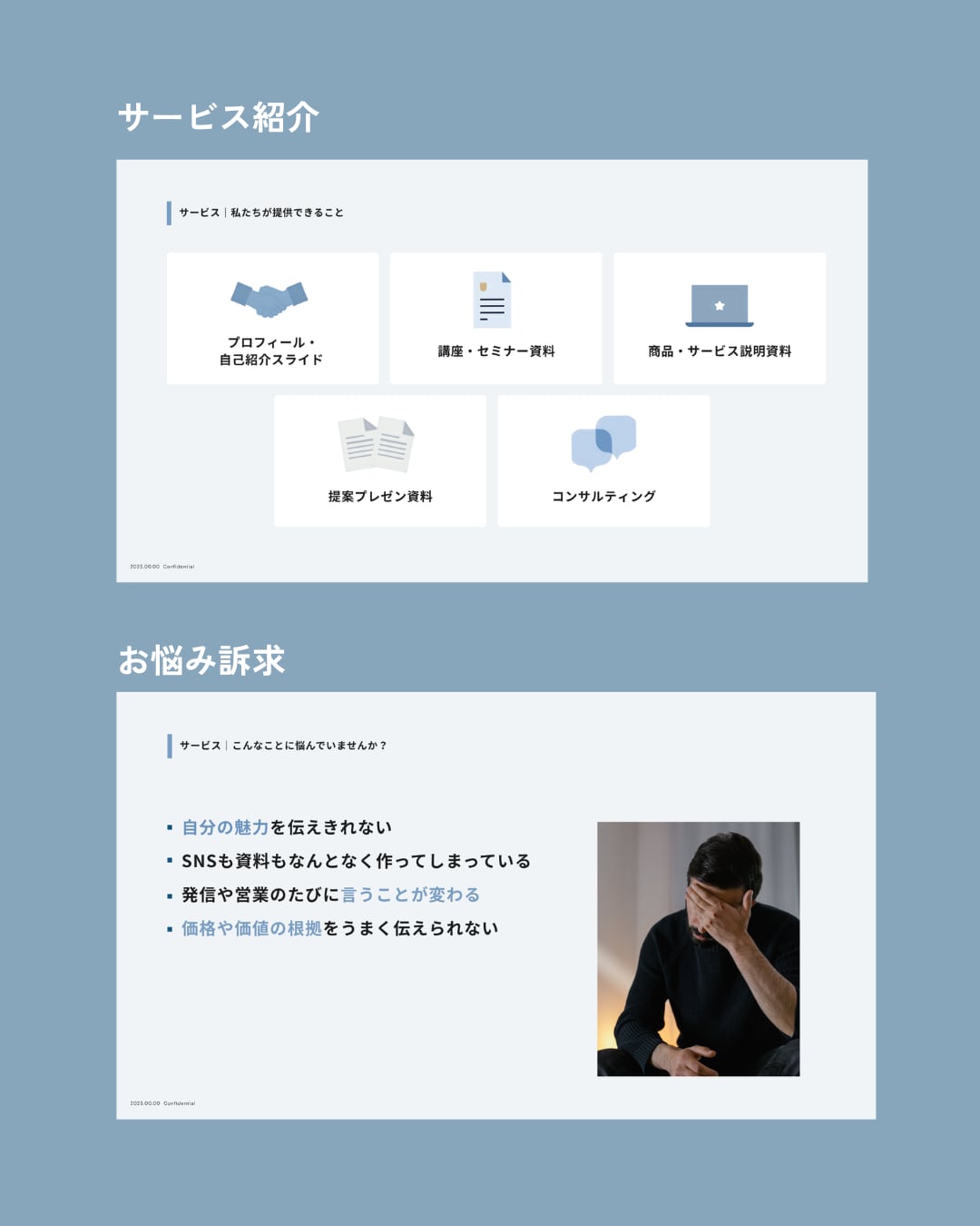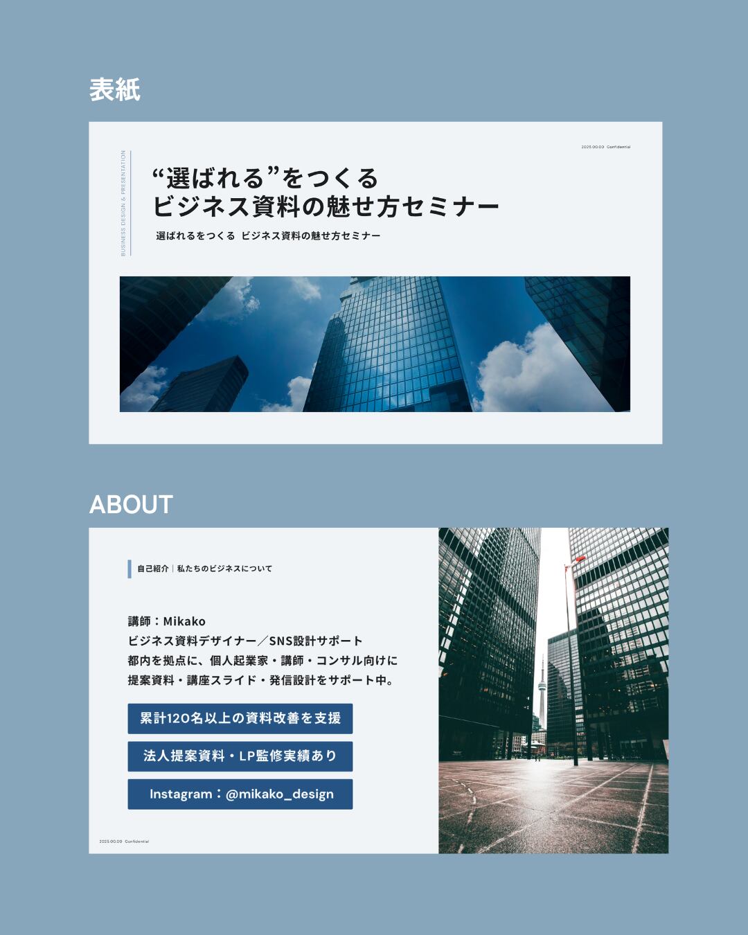 写真やテキストを差し替えるだけで、信頼感のある資料がすぐ完成します。